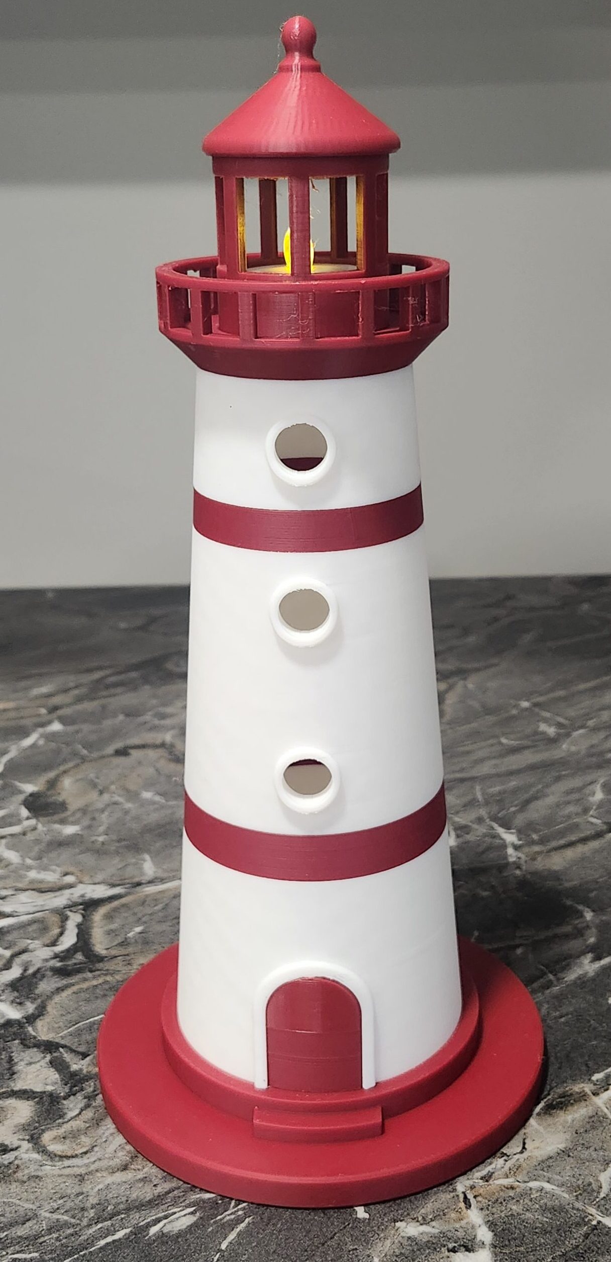 This is nautical-themed lighthouse decoration can be used as a nightlight. This 3D-print can also serve as a charming tabletop centerpiece for coastal or beach-themed deco. Base: A tea light can be placed within the base of the structure. Top: Another tea light is intended for the lantern room at the top. The use of electric or LED tea lights is recommended for safety.