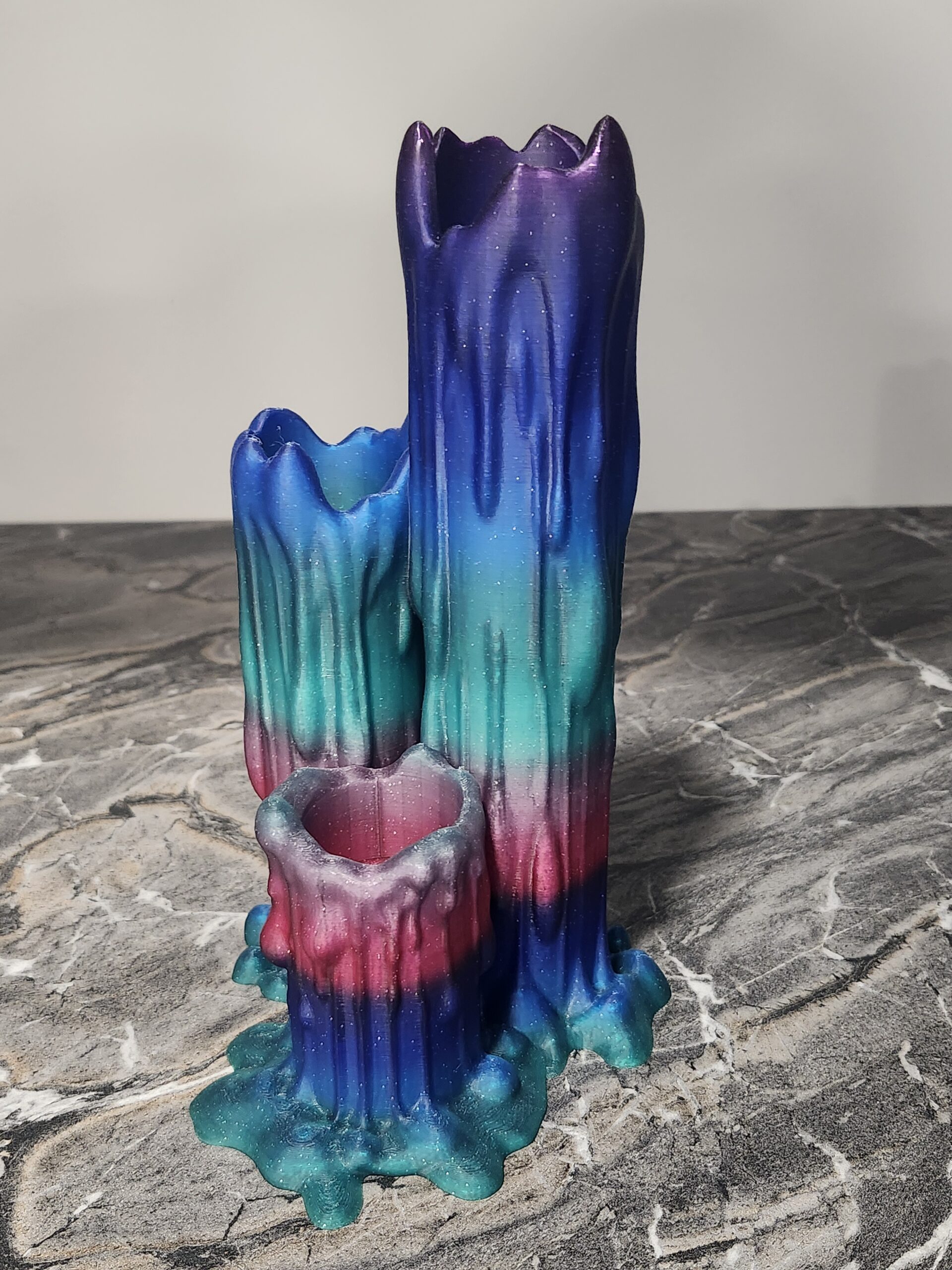 This 3D print is designed with three varying heights. The piece showcases heavy, gravity-defying “drips” that pool at the base, creating a fluid, trippy appearance. Its is a functional multicolor design. The tealights are included in the purchase.