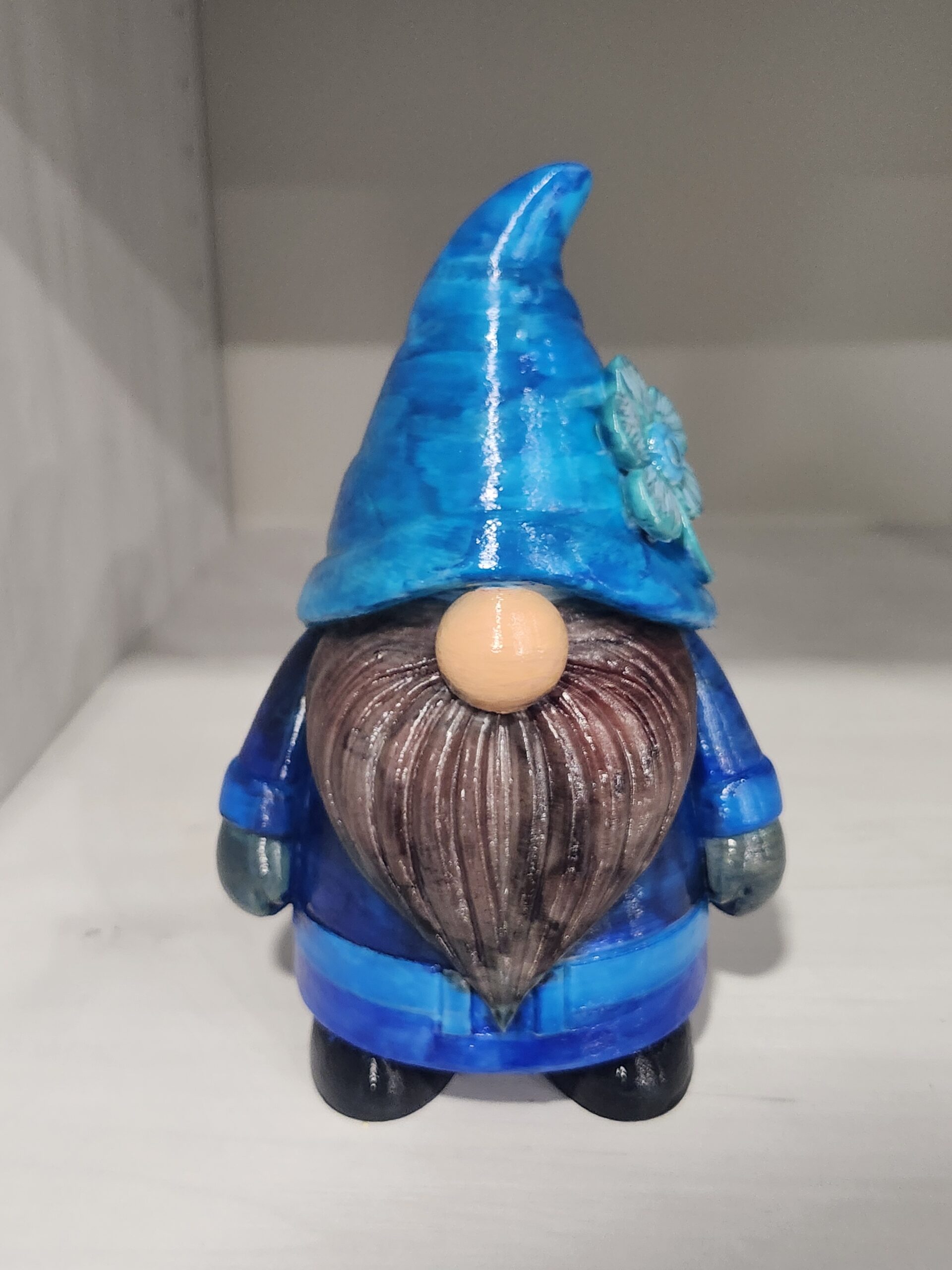 This is a handmade gnome figurine that’s been 3D printed and hand painted. Such gnomes are often used as whimsical decor for gardens, indoor plants, desks, or shelves.