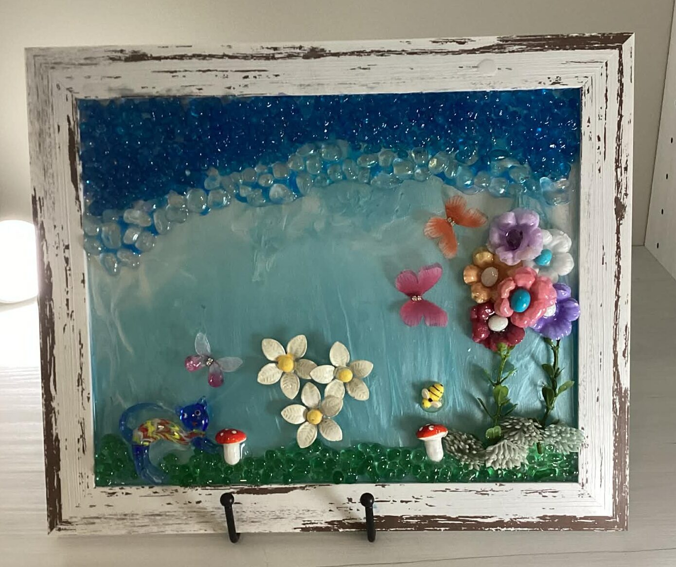 This is a handmade, framed resin art piece depicting a whimsical garden scene. The artwork is set within a distressed white wooden frame and features a layered, three-dimensional design: The top section uses clear and blue glass pebbles to represent a sky, transitioning to a light blue, wave-like resin background. This charming, mixed-media resin art piece captures a whimsical, miniature garden scene within it’s rustic distressed white frame.
