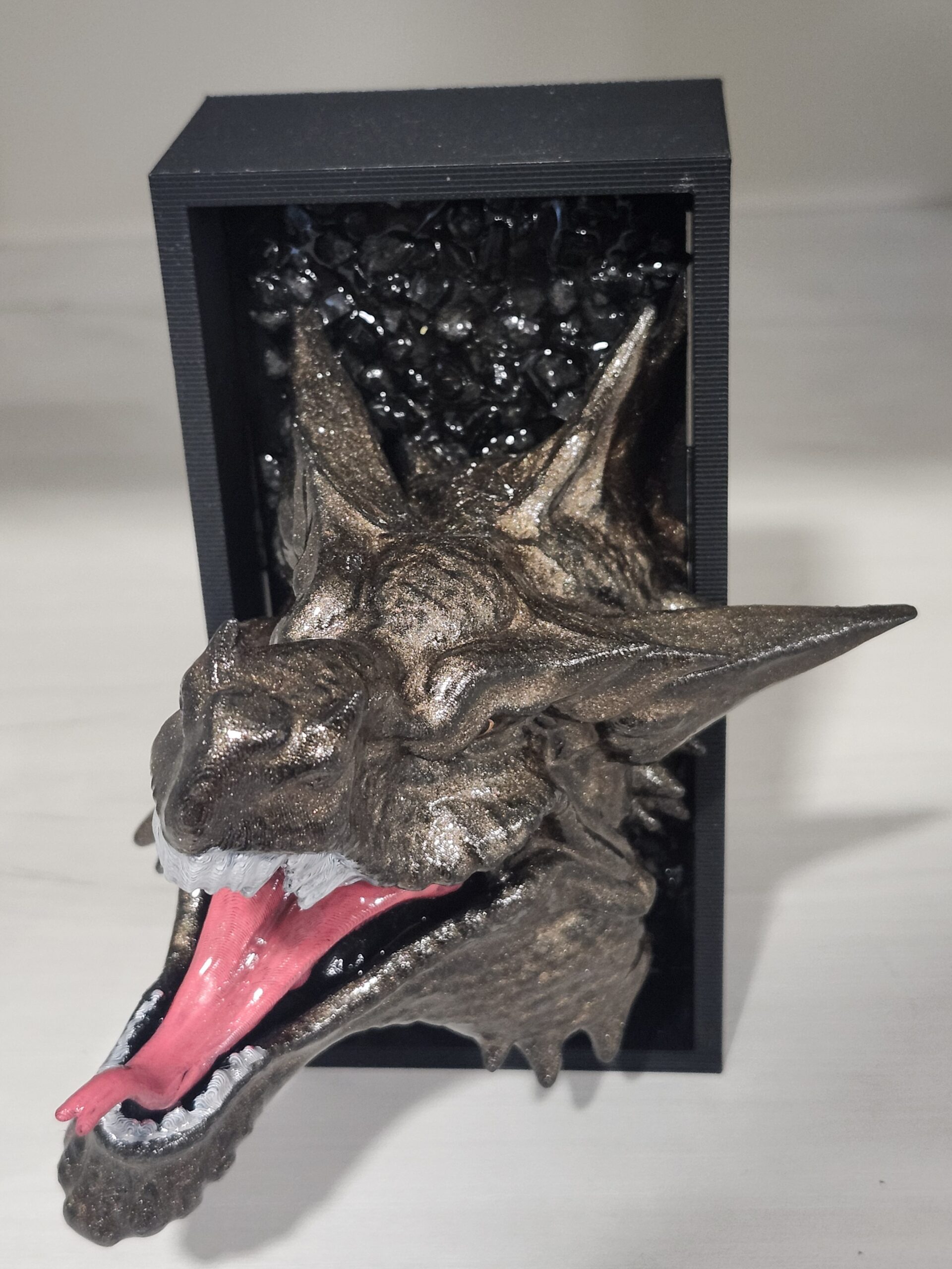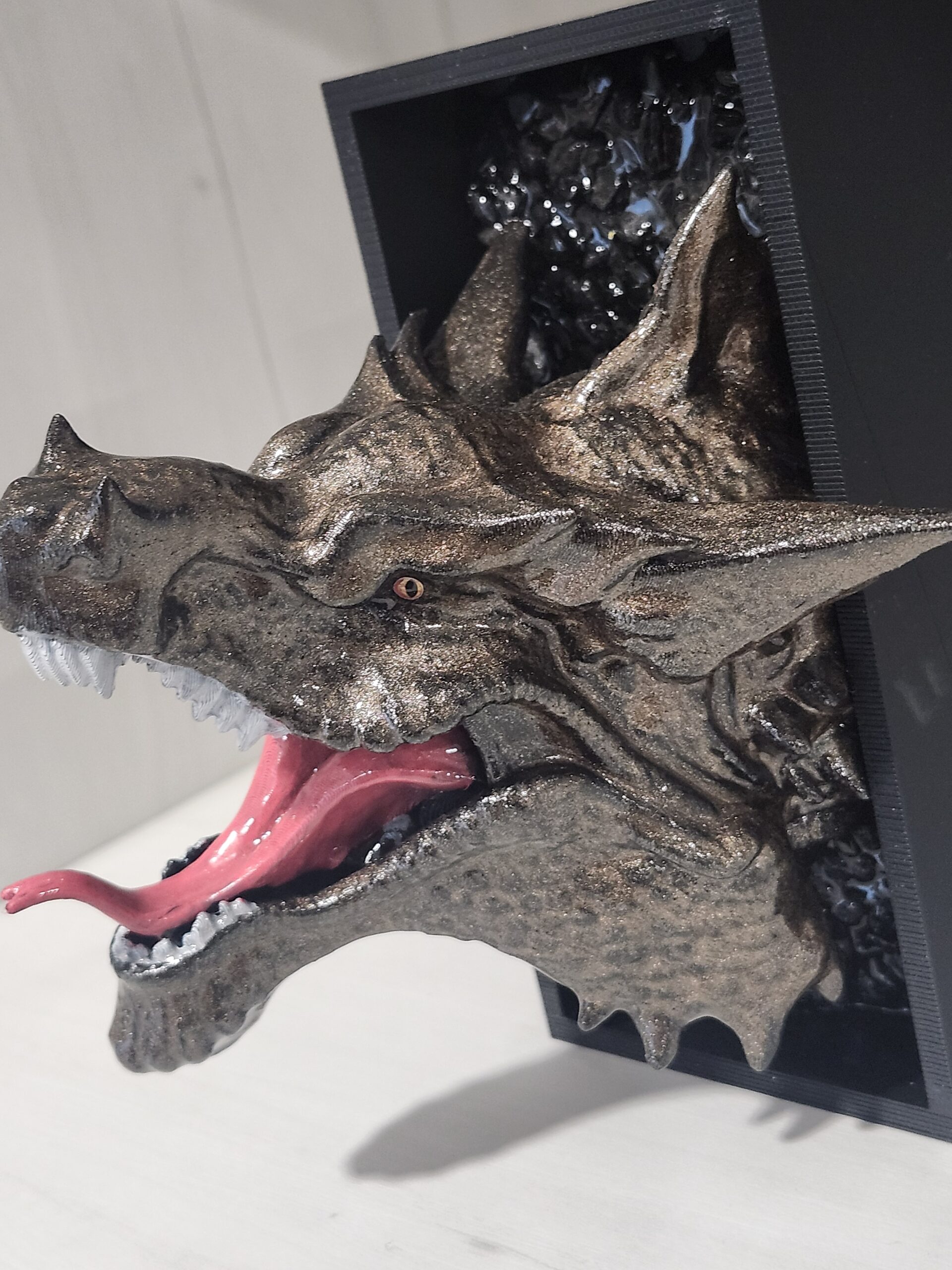 This is a Gothic dragon head bookend. Hand painted and sealed with Resin. There is a black stone background behind the dragon.It features a detailed, realistic sculpture of a dragon’s head emerging from a dark, box-like frame, designed to hold books upright and add an eye-catching decorative touch to any space. Suitable for decorating bookshelves, desks, living rooms, bedrooms, or bars, and makes a great gift for dragon enthusiasts. NOTE: This product is lightweight.