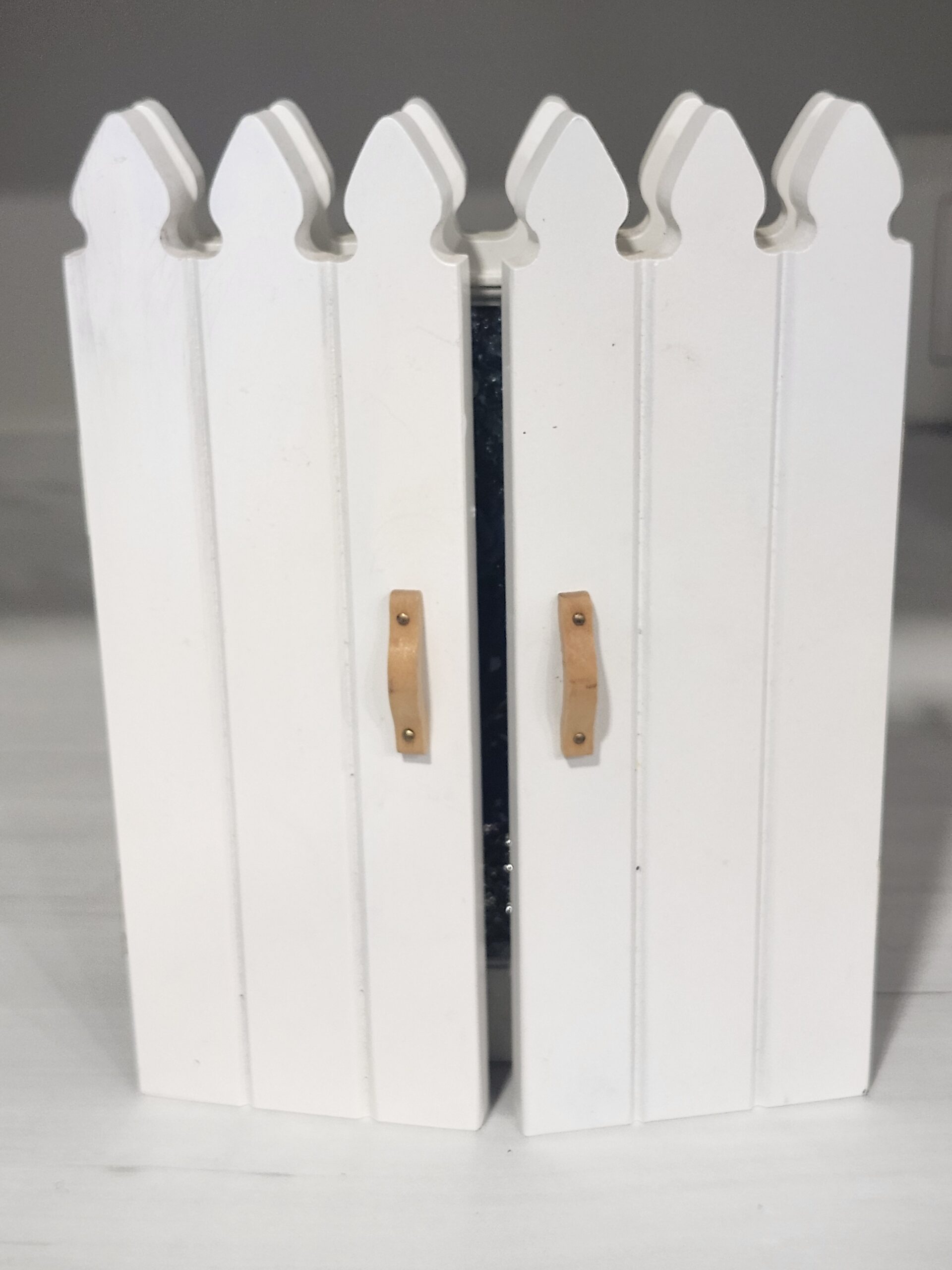 a decorative freestanding frame designed to look like a white picket fence with hinged side panels.