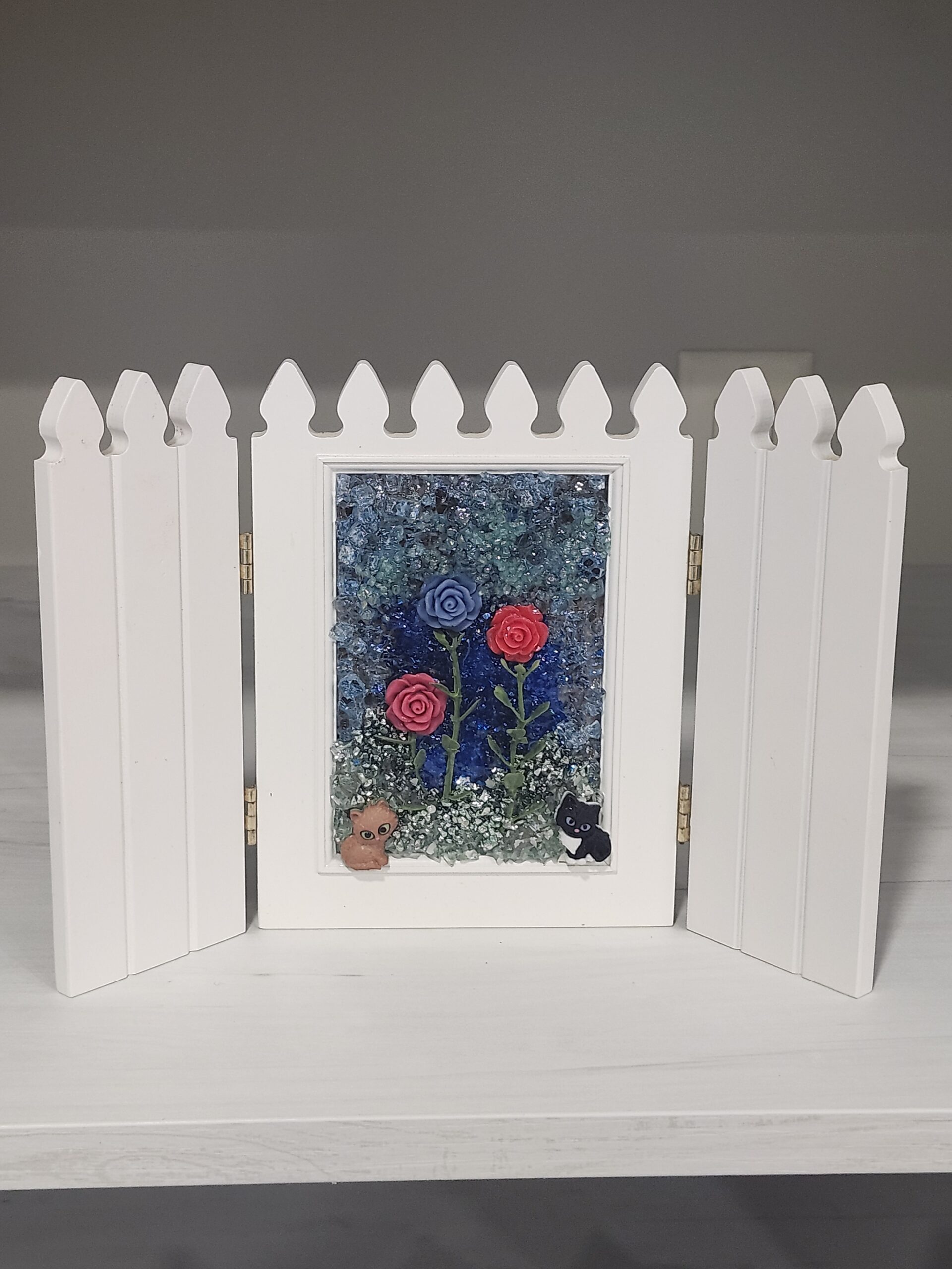 The central framed area features an artificial scene with two red roses and one blue rose on green stems, set against a background of crushed blue and clear glass. At the bottom of the scene, there are two small figurines: a brown cat on the left and a black cat on the right. The entire piece is sitting on a white surface. Contains resin and sea glass.