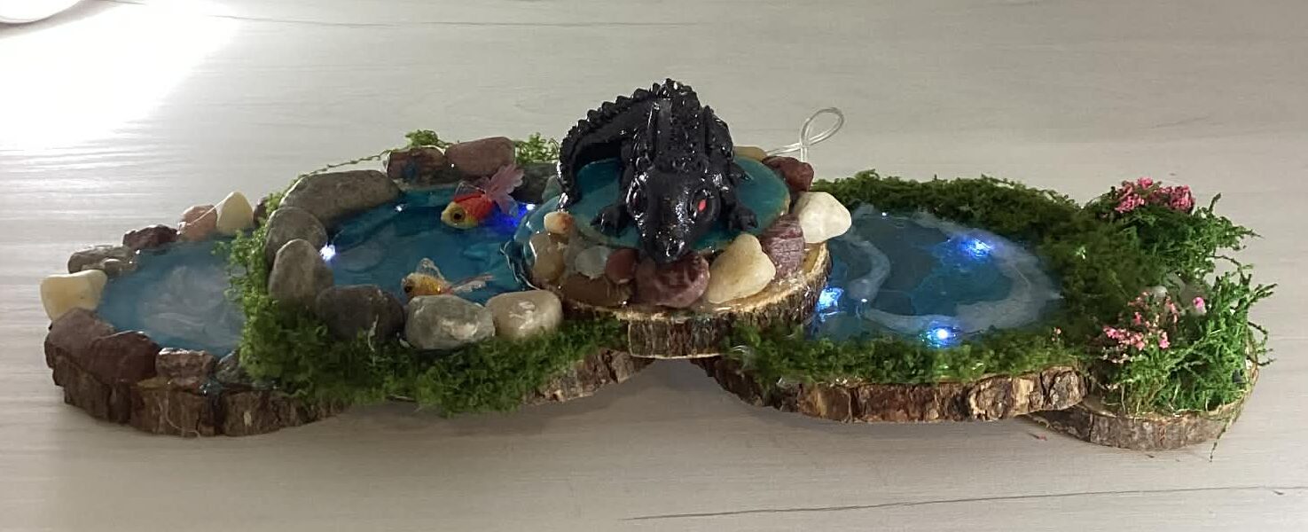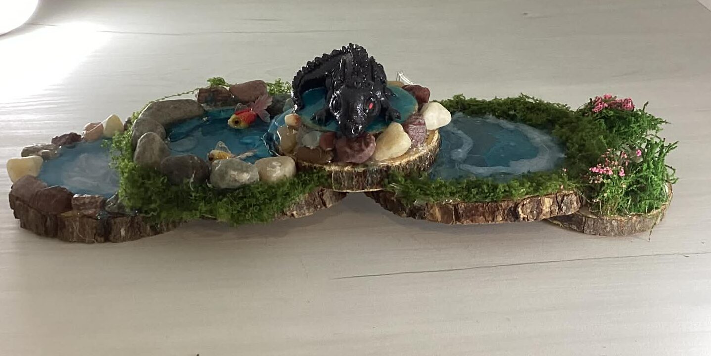 The image displays a miniature, handcrafted decorative water feature or diorama. It consists of multiple connected blue water ponds set into sections of tree bark or wood slices, creating a natural, rustic base with a black dragon on top. The pond also lights up.