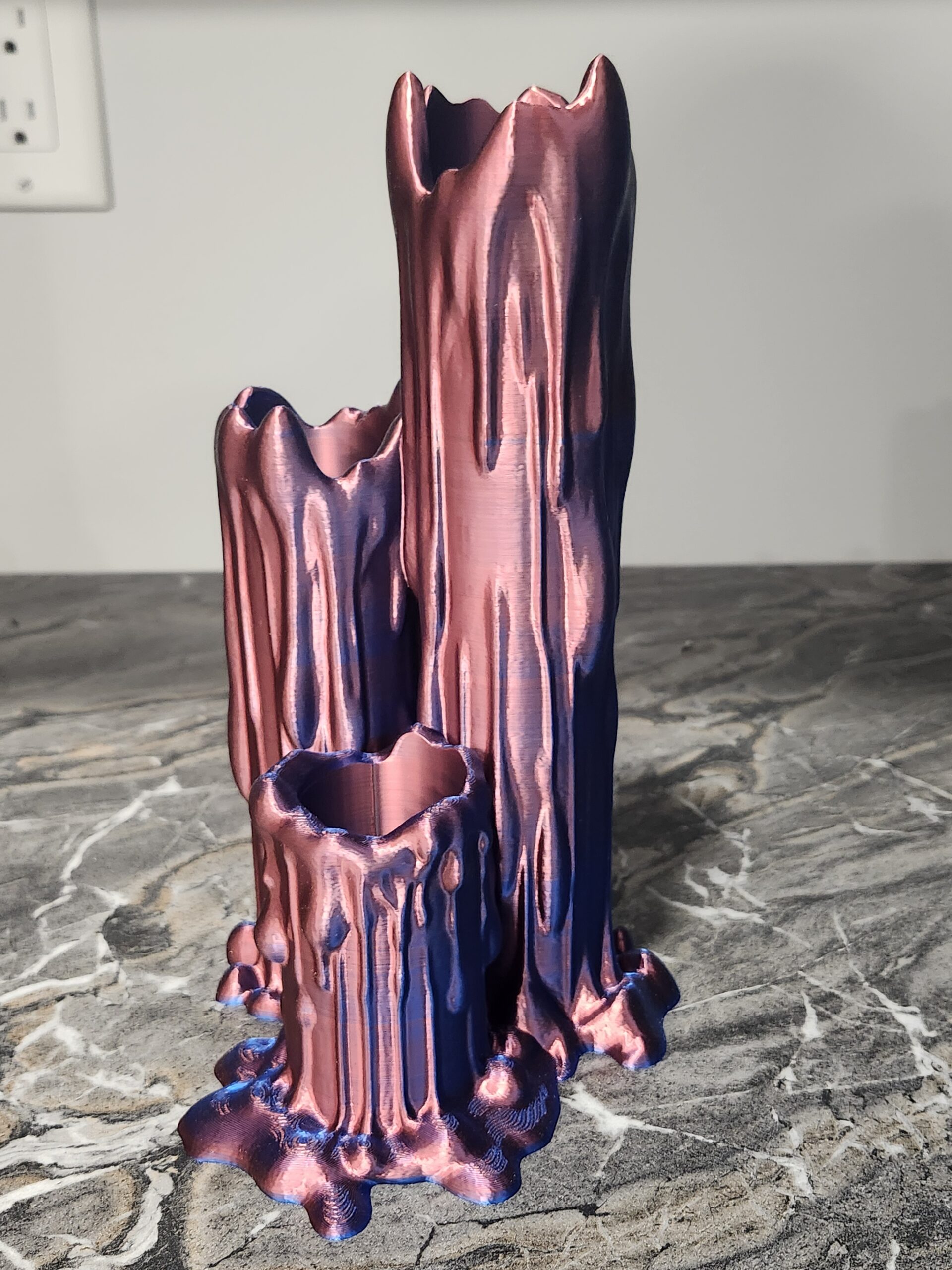 This item consists of three interconnected, hollow, stump-like forms of varying heights. The design features a distinctive “melted” or “dripping wax” aesthetic, with fluid lines running down the sides and pooling at the base. It is made from a material with an iridescent, duo-chrome finish that shifts color depending on the viewing angle and lighting. It primarily appears as a shimmering metallic pink or rose gold, transitioning to a deep, vibrant blue or purple in shadowed areas. Tea lights included with purchase.